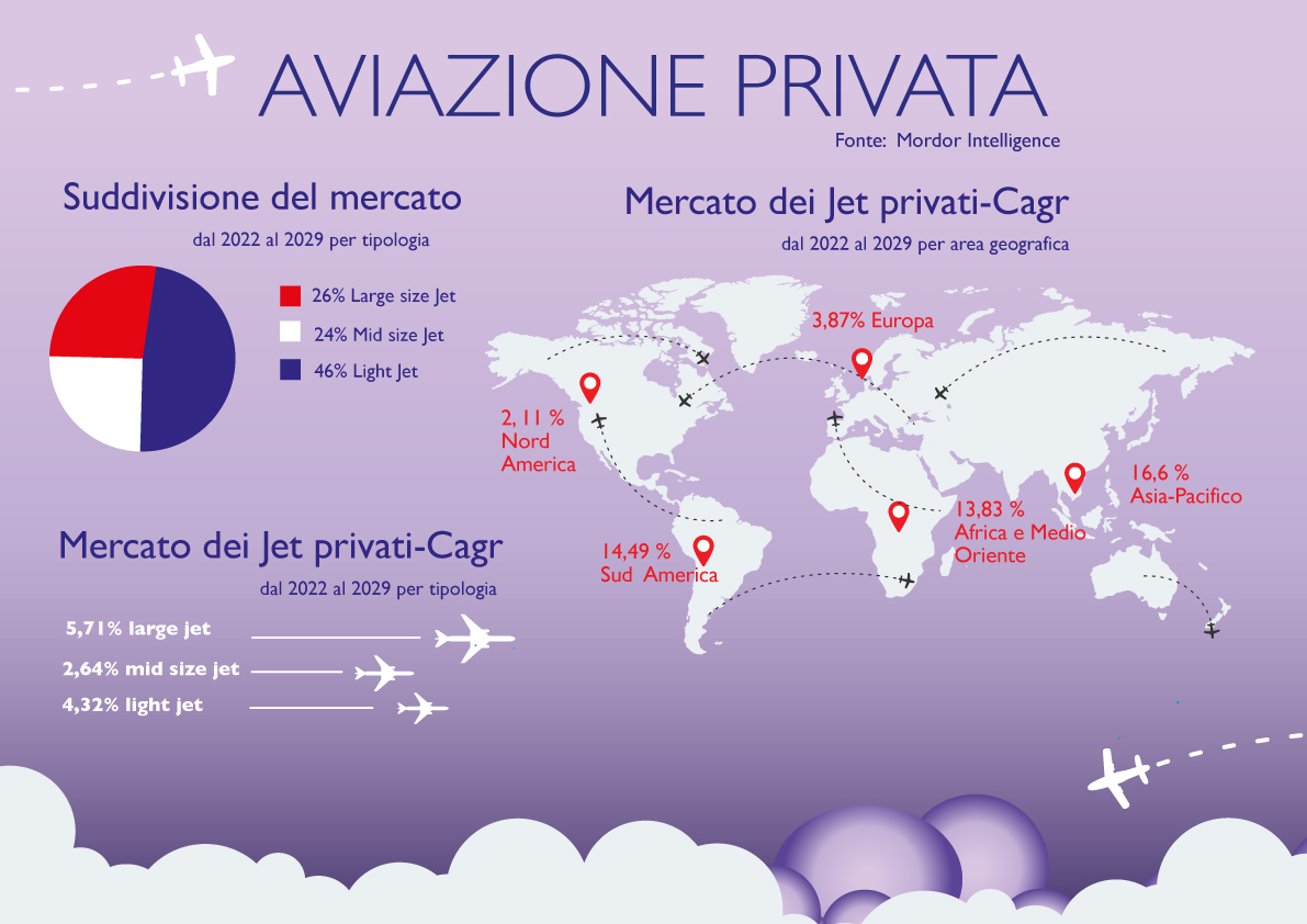 Si prevede che il mercato globale dell’aviazione privata metterà a segno un tasso di crescita annuo composto (Cagr) del 4,06% dal 2022 al 2029, raggiungendo un valore di 38,34 miliardi di dollari entro il 2029.