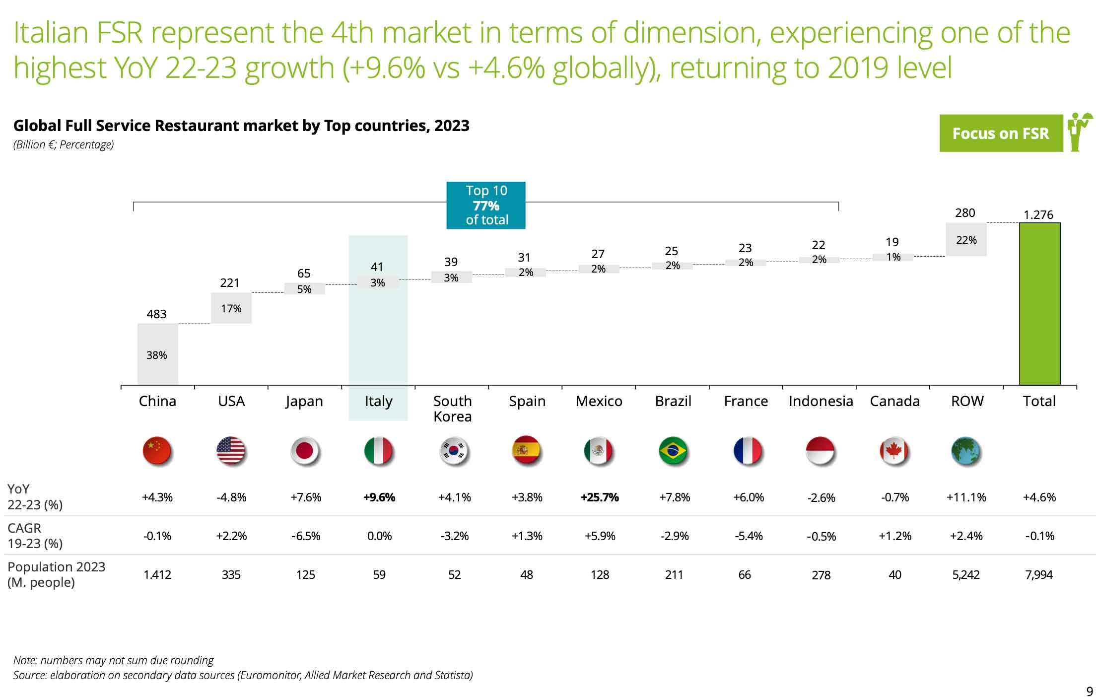 Nel 2023 il mercato globale della ristorazione ha raggiunto un valore di 2,8 trilioni di euro, con un incremento medio annuo del +2% (CAGR 2019-2023). Si tratta di un ritorno ai livelli di crescita pre-pandemia, segnale di stabilità e consolidamento del settore.Tra i formati, i Full Service Restaurant hanno finalmente recuperato il valore pre-Covid, confermando il ruolo centrale della ristorazione tradizionale nonostante la concorrenza di format più rapidi e digitalizzati.