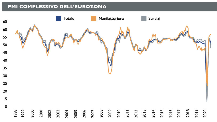 Di fronte a un ritorno dei vizi del passato non sorprende scoprire che i dati macro abbiano cominciato a mostrare scricchiolii già lo scorso settembre, in particolare per quanto riguarda il fondamentale mega-comparto dei servizi. Un riassunto delle indicazioni fornite dal Pmi europeo viene offerto da Martin Moryson, chief economist Europe di Dws: «Gli indici dei responsabili degli acquisti nell’Eurozona hanno subito un nuovo forte calo a settembre. L’indice complessivo è sceso da 51,9 punti a 50,1. Sebbene sia ancora oltre la soglia di espansione di 50 punti, è appena sopra. Il calo dell’indice complessivo è dovuto al settore dei servizi, che è passato da 50,5 punti a 47,6 L’aumento dei tassi di infezione e le nuove misure di prevenzione sono probabilmente la causa principale di questo fenomeno».