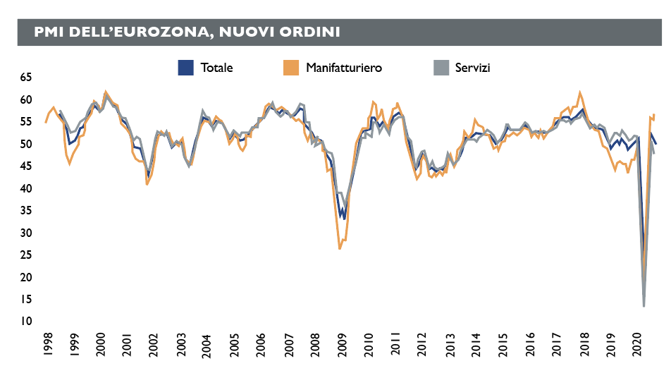 Che cosa possono dunque attendersi gli investitori per quanto riguarda l’economia europea? Per rispondere al quesito, per il momento conviene non considerare gli effetti di un possibile secondo lockdown generalizzato, perché sarebbero talmente devastanti da richiedere misure ancora più drasticamente eccezionali rispetto a quelle viste finora e quindi oggi difficilmente valutabili. Il rischio più concreto, però, è che nel Vecchio continente si torni al recente passato, con una ripresa tenue affidata soprattutto all’export manifatturiero trainato da Usa e Asia che, al solito, sembrano mostrare maggiori segni di vitalità.