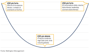 Sempre secondo la teoria, il dollaro tende invece a indebolirsi nella fase intermedia del ciclo (la parte inferiore del “sorriso”), quando la crescita degli Stati Uniti rallenta rispetto al resto del mondo.