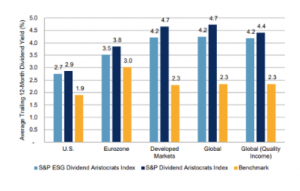 La tabella illustra il rendimento medio storico dei dividendi dei 12 mesi precedenti degli indici regionali S&P ESG Dividend Aristocrats rispetto ai rispettivi indici S&P Dividend Aristocrats e agli indici di riferimento generali.